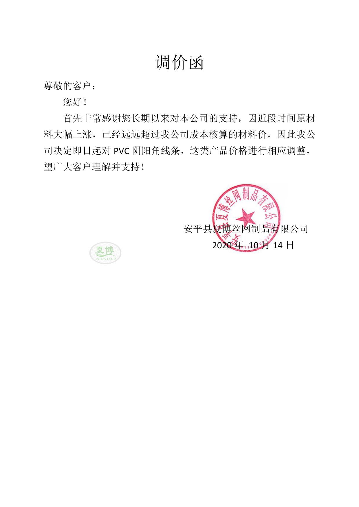 安平縣夏博絲網制品有限公司關于陰陽角調價的通知