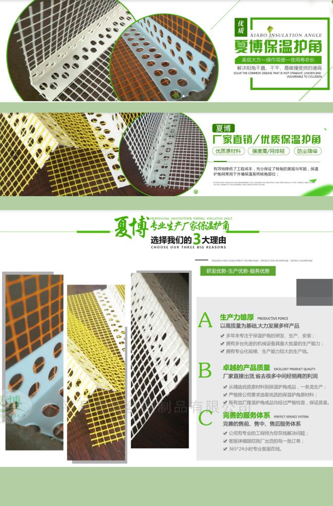 夏博公司業(yè)務(wù)員經(jīng)常有客戶打電話來詢問護角網(wǎng)上的網(wǎng)格布能不能粘在pvc護角網(wǎng)的內(nèi)側(cè),從生產(chǎn)工藝上來說是完全可以的,但是從施工方面來說是不行的,大家想一下,如果網(wǎng)格布在產(chǎn)品的外側(cè),受到外界撞擊時護角條先受到,時間一長保溫層就會,網(wǎng)格布時間長了也會受到撞擊而受損。但是如果網(wǎng)格布在外側(cè),外面的網(wǎng)格布受到,里面的護角條還會保護墻角。
